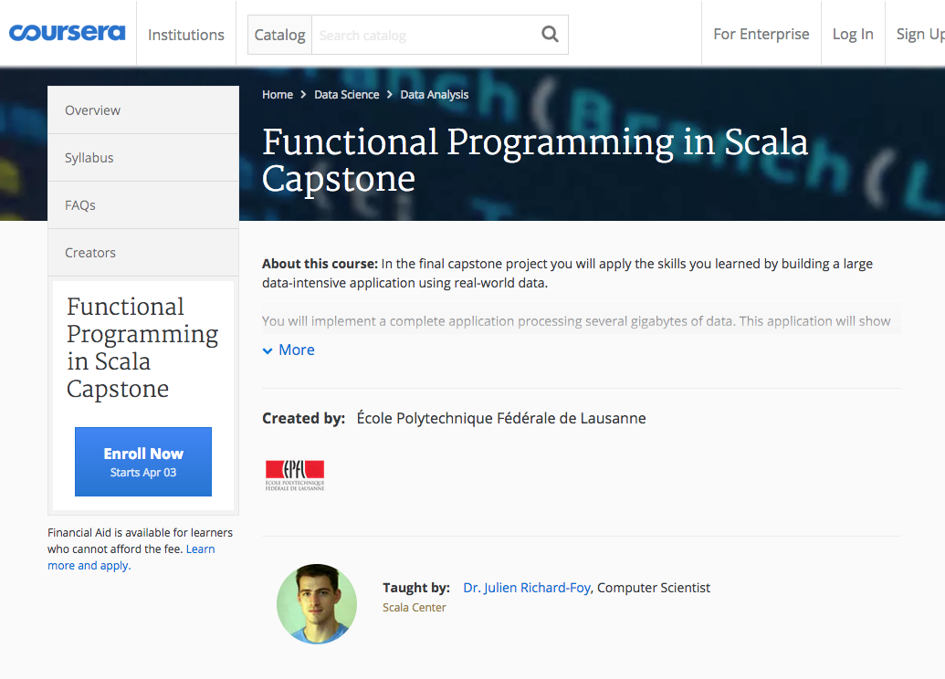 We’re very excited to announce that our new MOOC “Big Data Analysis with Scala and Spark” and the Scala Specialization Capstone project are now live on Coursera!