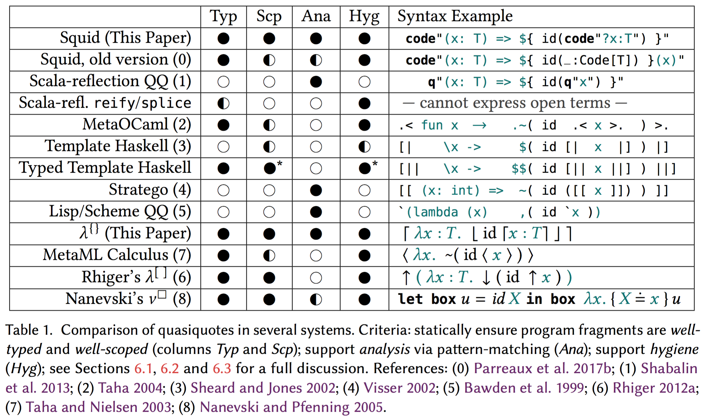 To learn more about Squid works, I highly recommend reading their upcoming POPL 2018 paper “Unifying Analytic and Statically-Typed Quasiquotes”. Here is just one interesting table from the paper that I want to include here
