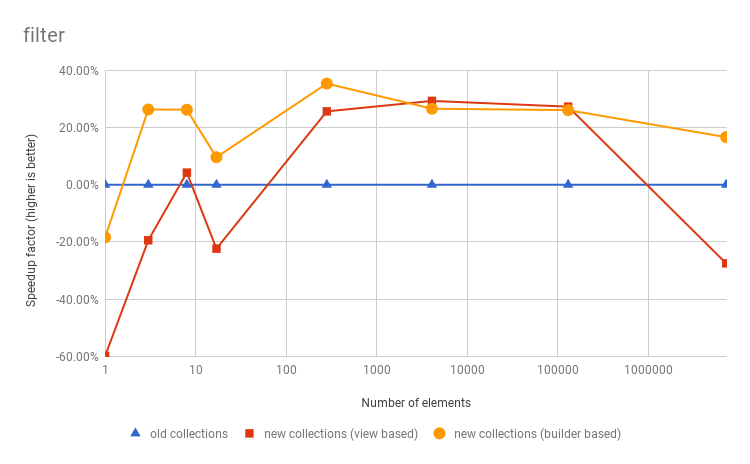 This article studied the performance of the new collections. I’ve reported that view based operation implementations are about 25% slower than builder based implementations, and I’ve explained how we restored builder based implementations on strict collections. Last but not least, I’ve shown that defaulting to view based implementations does make sense for the sake of correctness.