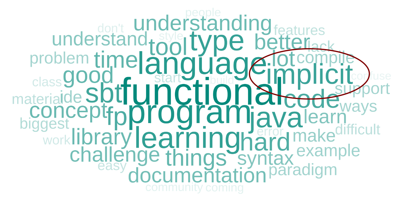 In the 2018 Scala developer survey, the word “implicit” showed up in the question “In learning Scala, what was the biggest challenge you faced?”